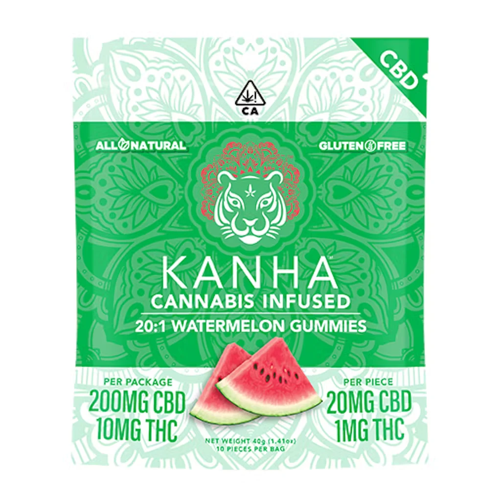 KANHA 20:1 Watermelon CBD Gummies 200mg CBD x 10mg THC per bag Beloved in Africa since prehistoric times, watermelon went global when the Roman Empire discovered the juicy fruit and spread it throughout the Mediterranean. Now the favorite fruit of backyard summer parties, watermelon balances sweet, sour and bitter tastes that we capture in our 20:1 Watermelon CBD, featuring 20mg of CBD and just a touch of THC in every piece. These terpene-rich gummies are ideal for enjoying the benefits of CBD while remaining focused and functional. Instructions: Eat 1 gummy. Wait 90 minutes for full effect. Keep in a cool, dry place. Avoid temperatures over 75°F. Ingredients: Tapioca Syrup, Cane Sugar, Water, Gelatin, Agar, Locust Bean Gum, Citric Acid, Carnauba Wax, Natural Flavor, Cannabis Oil, and Natural Color.